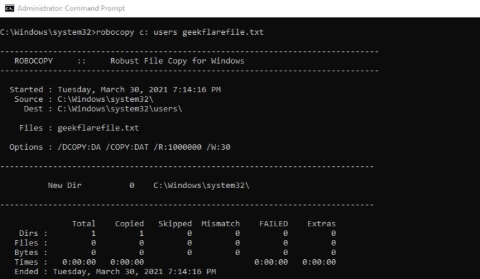 Эта команда похожа на стандартную функцию Windows, копировать/вставить, но за счет дополнительных параметров у нее намного больше возможностей. Основной формат команды robocopy <источник> <назначение> <файл> скопирует и вставит файл в нужную папку. При использовании параметров /nocopy и /s копирование не затронет информацию о файле и исключит пустые поддиректории.