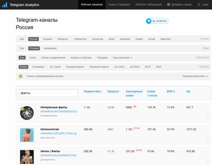 Считается основным (не официальным) инструментом для поиска каналов в Telegram. Группирует список по: