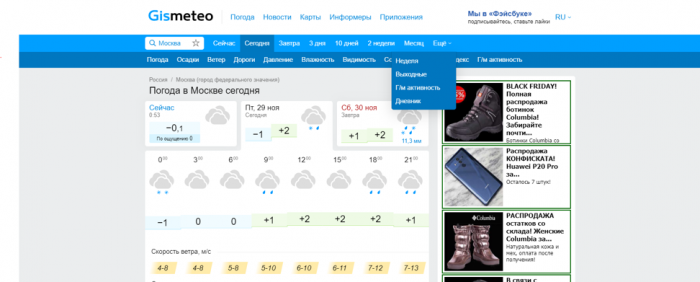 Интерфейс сайта Gismeteo интуитивно понятен, и глядя на таблицу можно получить такую информацию как: