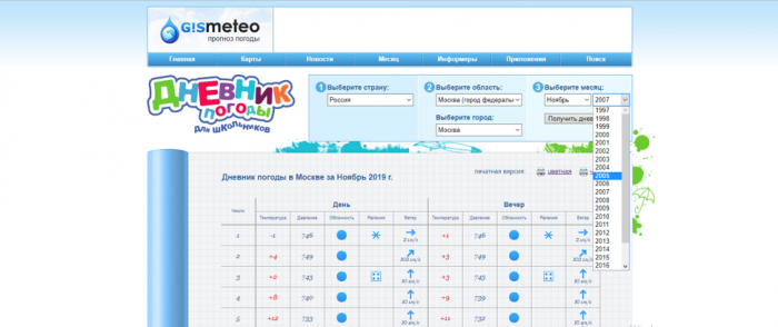 Также при необходимости можно распечатать историю погоды выбранного месяца нажав на кнопку «Печатная версия», расположенную вверху экрана.