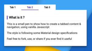 Material Design Tabs – скрипт закладок, построенный с использованием Vanilla JavaScript. Он простой в использовании, но и не поддерживает расширенные опции.