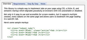 Tabtastic – это простой плагин для создания закладок с помощью CSS и JS. Он использует семантическую разметку, доступен для программ чтения экрана и поддерживает вложенные закладки на странице.