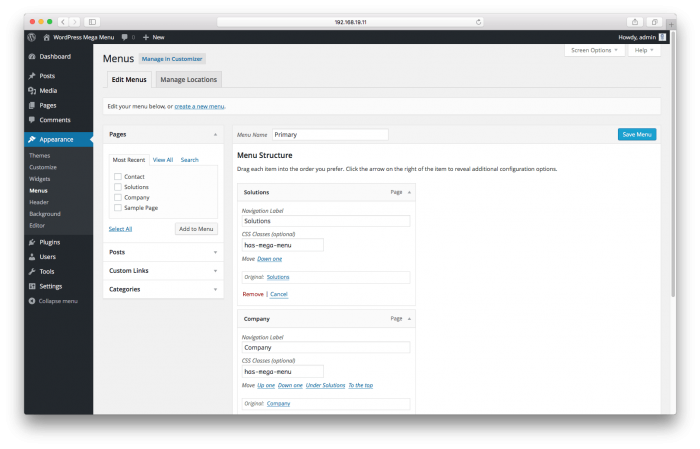 Теперь добавим класс «has-mega-menu» к двум пунктам, к которым будет прикреплен выпадающий список мега-меню. Не забудьте нажать кнопку «Сохранить меню», когда закончите.