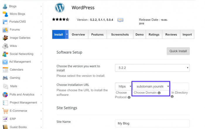 Инсталляция WordPress на субдомен с помощью автоматического установщика